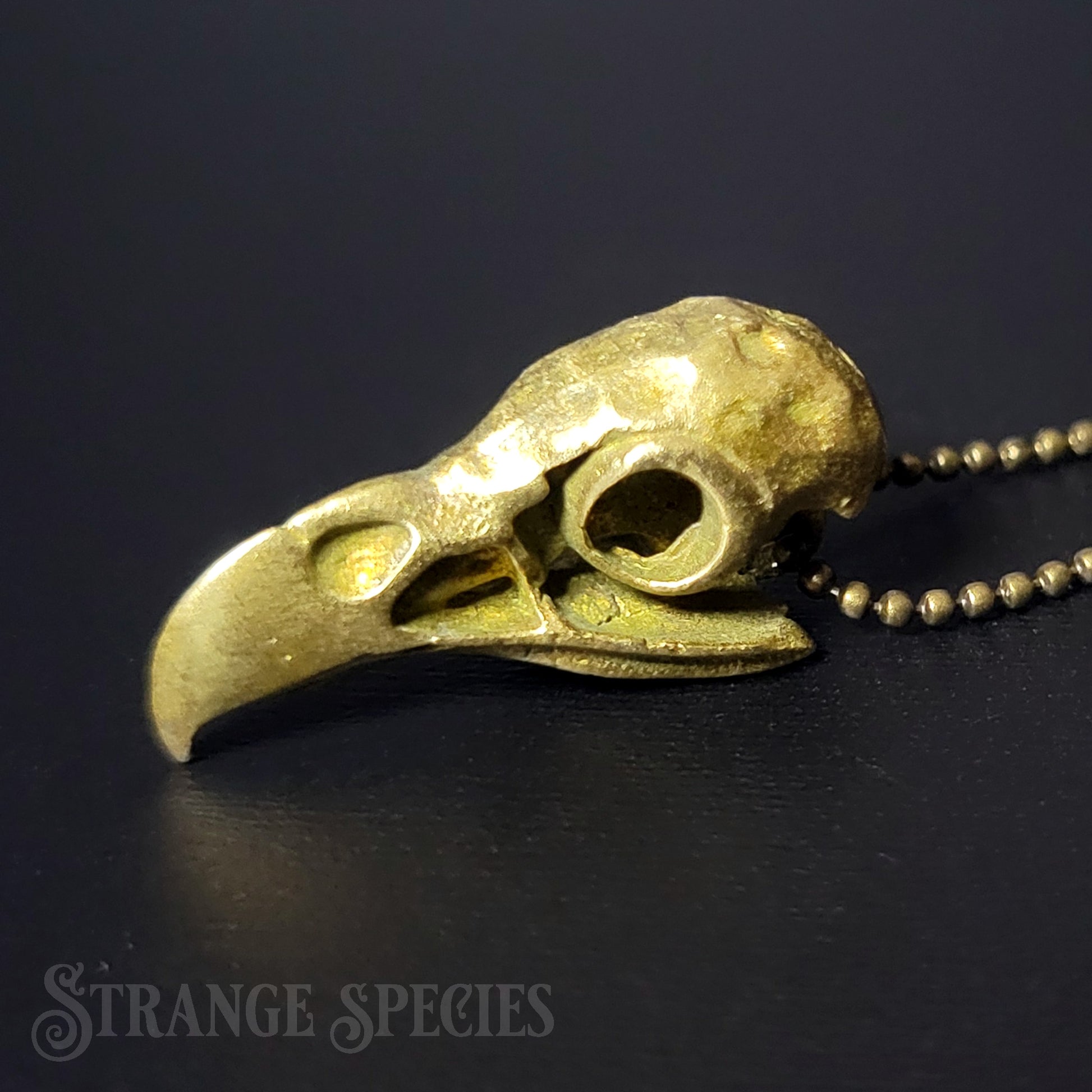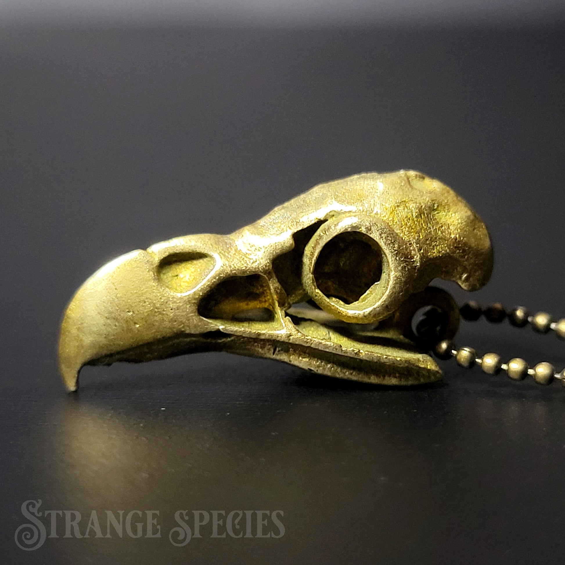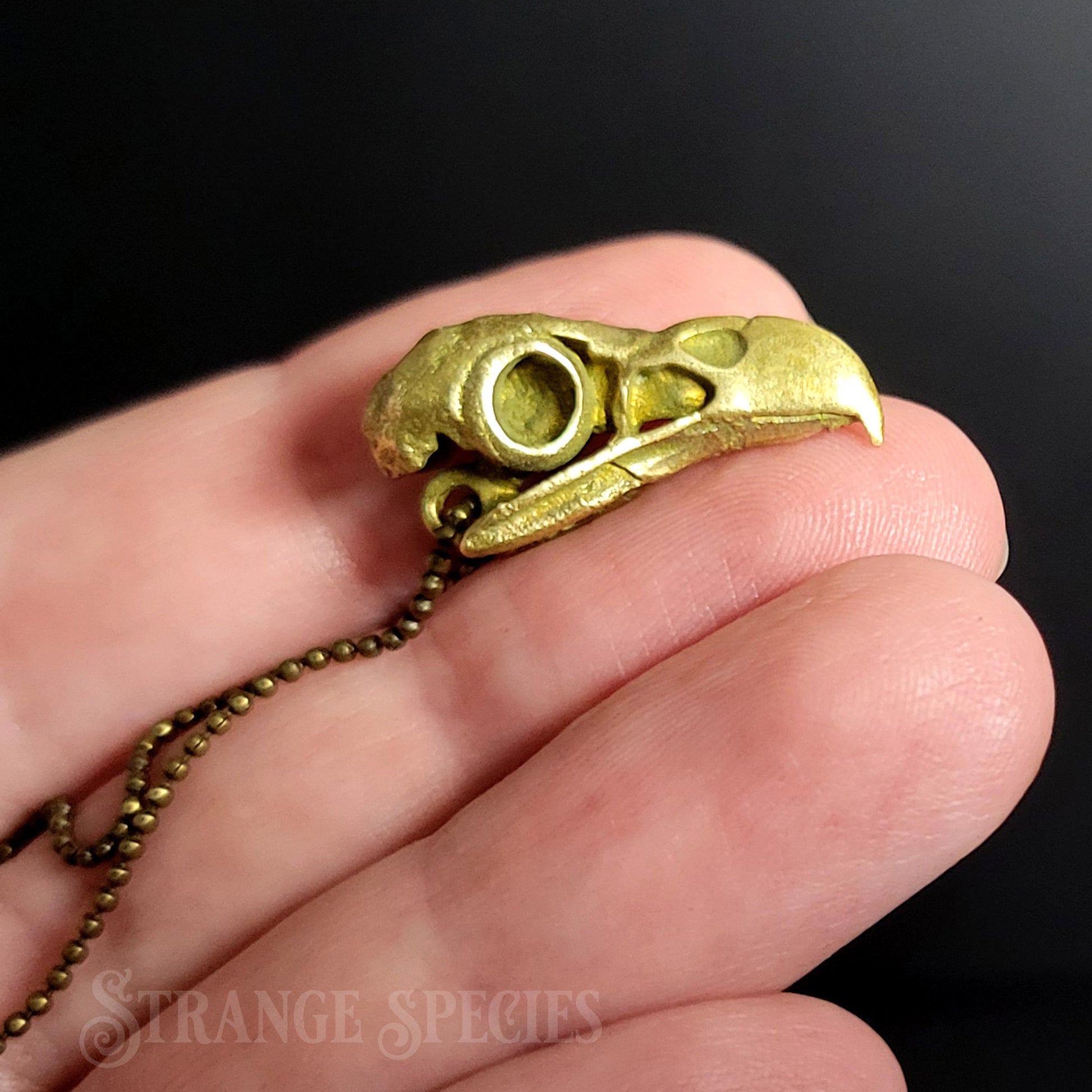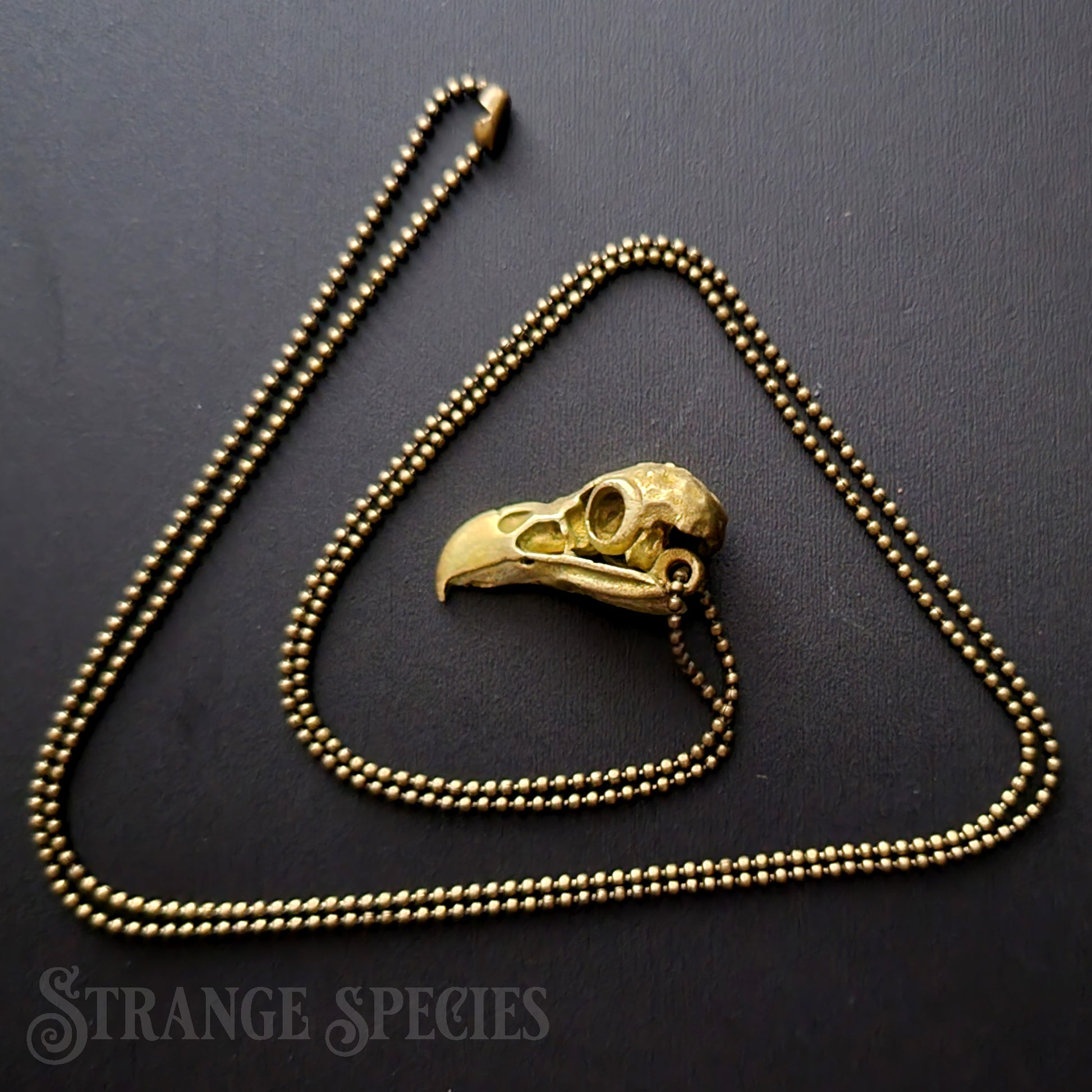 For the perfect touch of subtle Vulture Culture fashion, add this little brass eagle skull to your jewelry collection! Strung from a fine 24-inch ball chain necklace, this detailed 1-inch pendant is slightly aged solid brass; it's left unsealed so it will continue to develop a beautiful patina the more you wear and handle it.