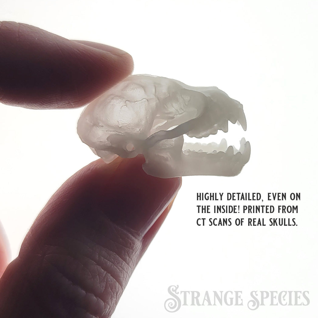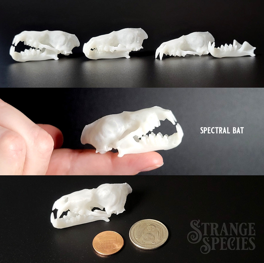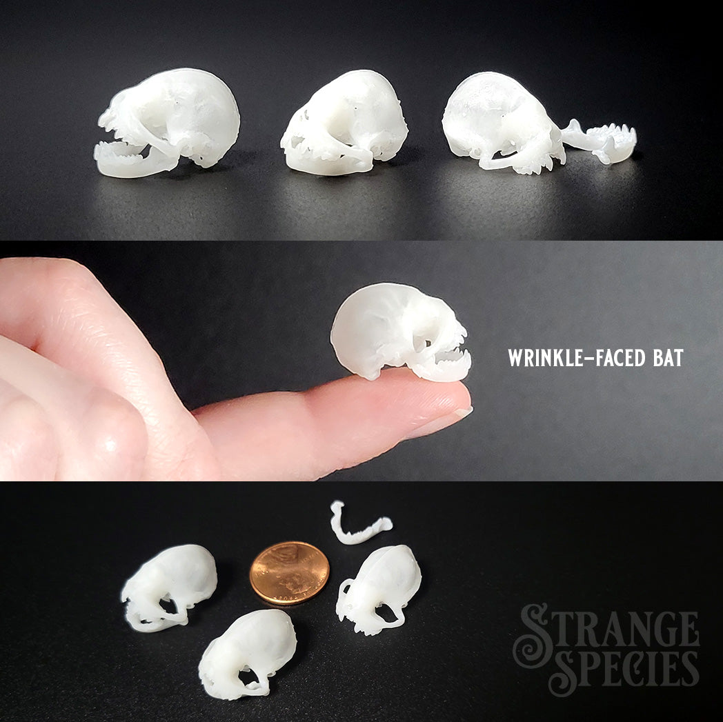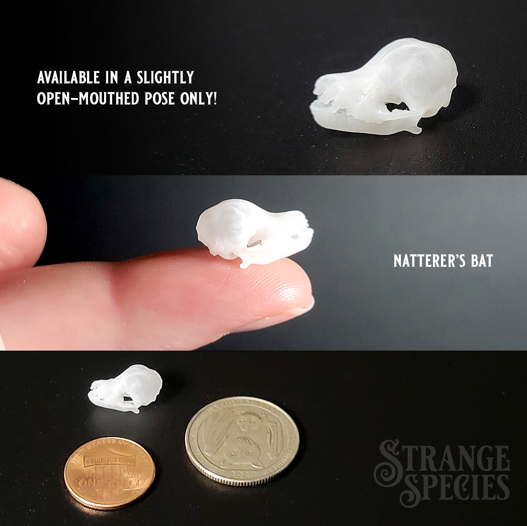 These little super-detailed life sized bat skull replicas are the perfect pieces for your studies of anatomy or as display pieces in your collection of tiny curios. Most of these are printed from models made with CT scans (with the exception of the Natterer's Bat) and are highly detailed and as anatomically accurate as possible. They're hollow and when held up to the light you can see the delicate interior structures of the skull (these are most visible in the white unpainted version, which allows light to pass through cleanly). They're about as close to the real thing as you can get without any dead bats! (Why buy replicas? Learn more about the ethics of collecting bats here!)