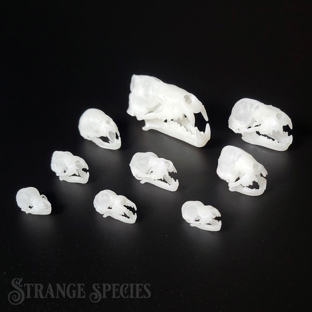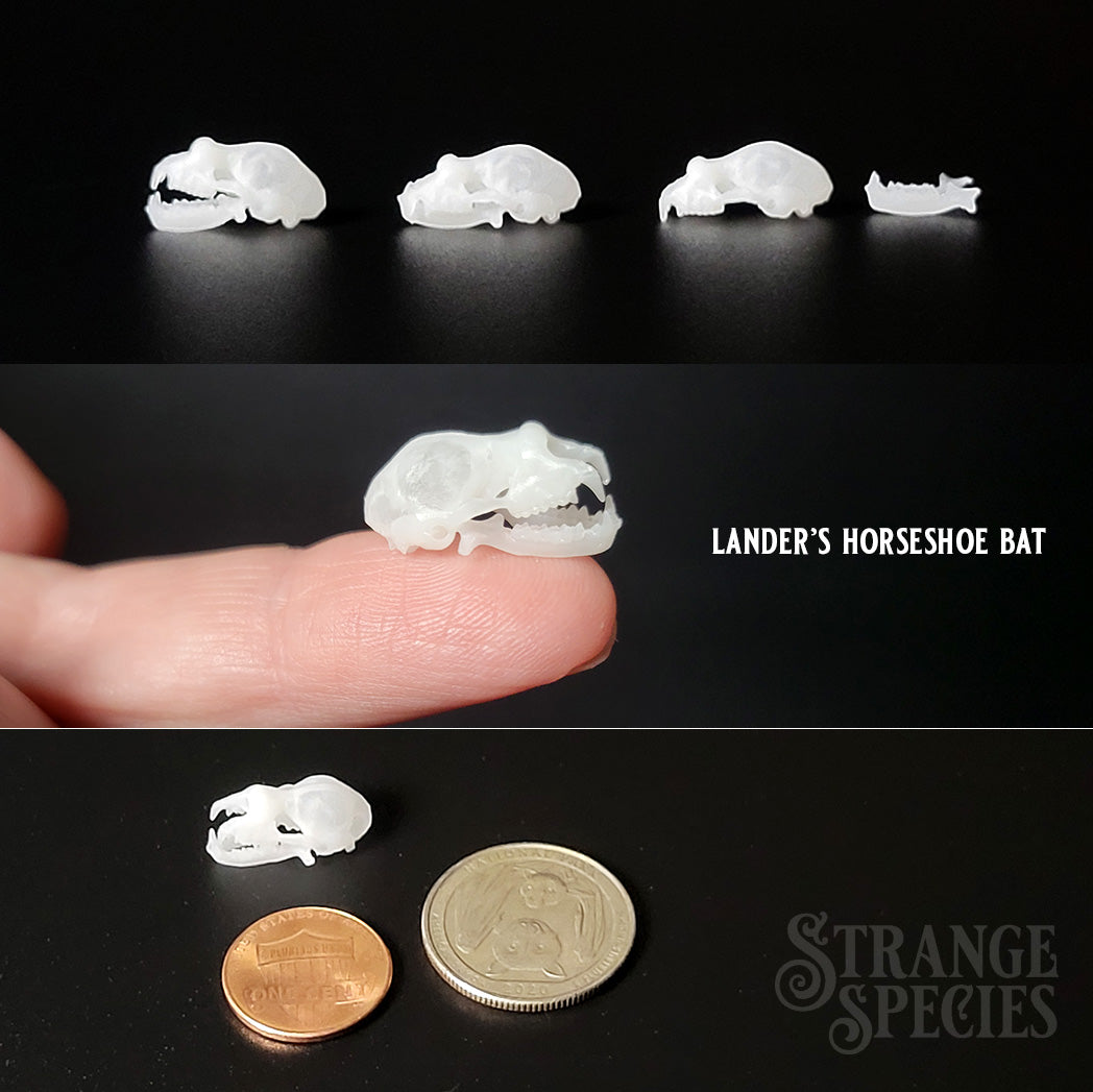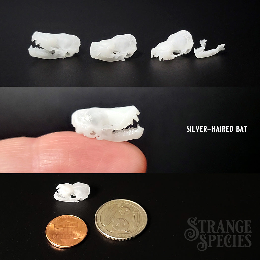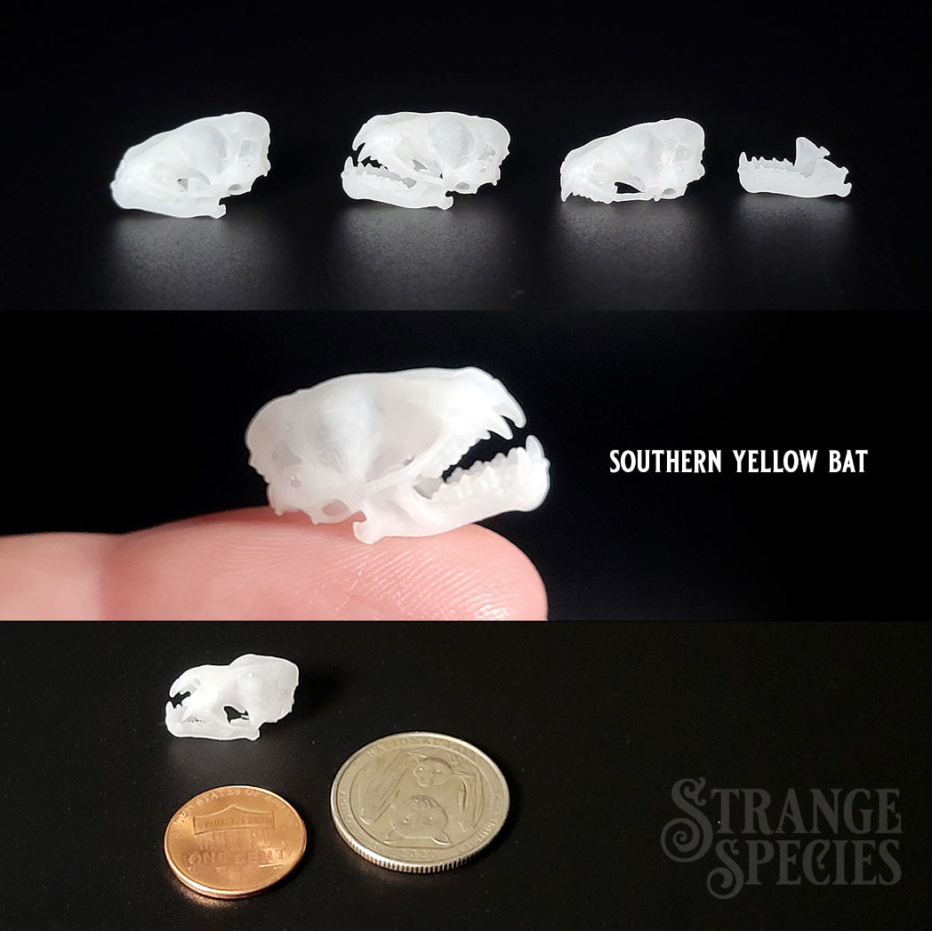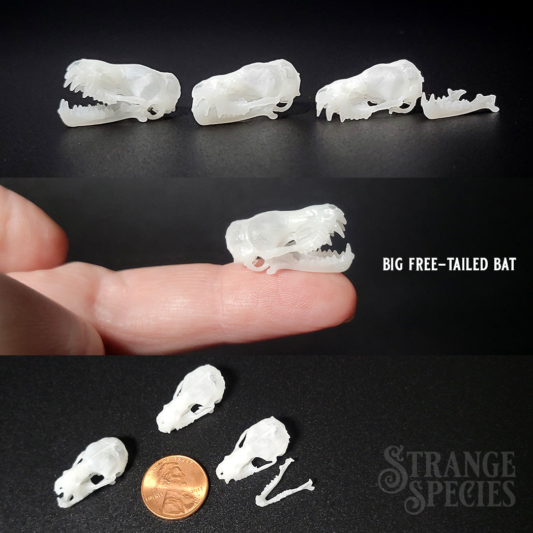These little super-detailed life sized bat skull replicas are the perfect pieces for your studies of anatomy or as display pieces in your collection of tiny curios. Most of these are printed from models made with CT scans (with the exception of the Natterer's Bat) and are highly detailed and as anatomically accurate as possible. They're hollow and when held up to the light you can see the delicate interior structures of the skull (these are most visible in the white unpainted version, which allows light to pass through cleanly). They're about as close to the real thing as you can get without any dead bats! (Why buy replicas? Learn more about the ethics of collecting bats here!)
