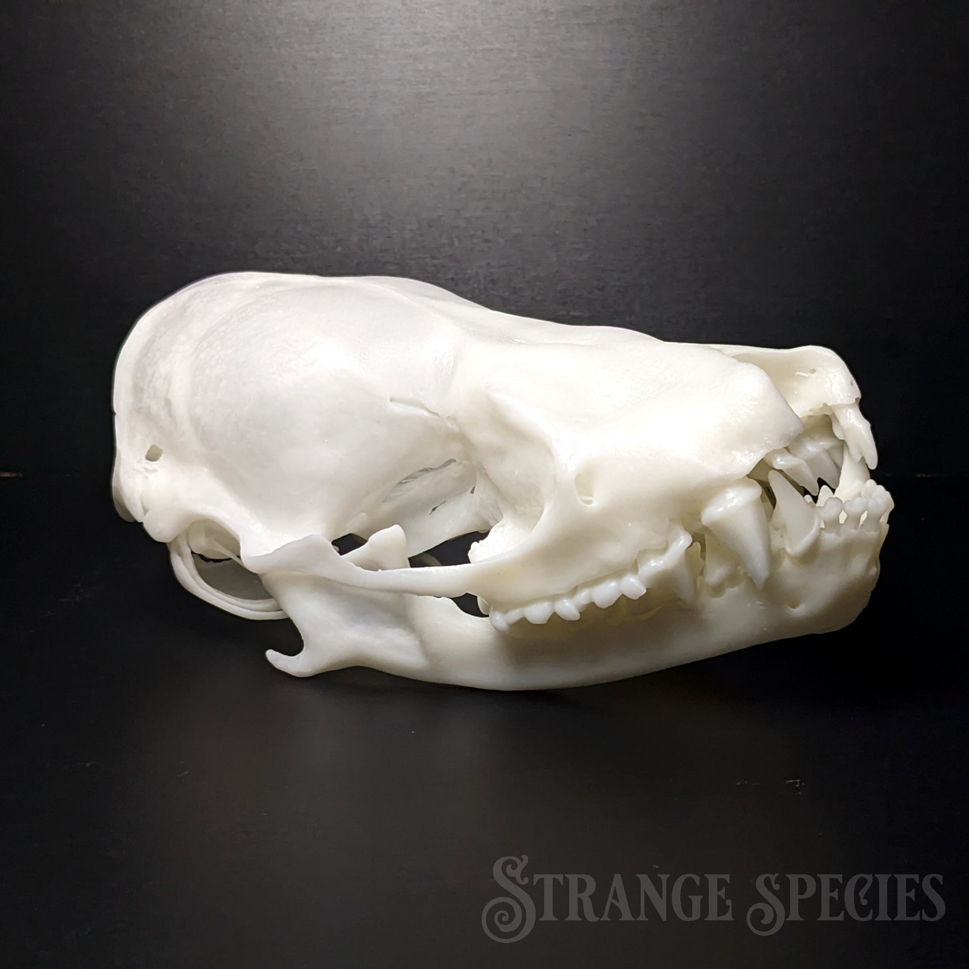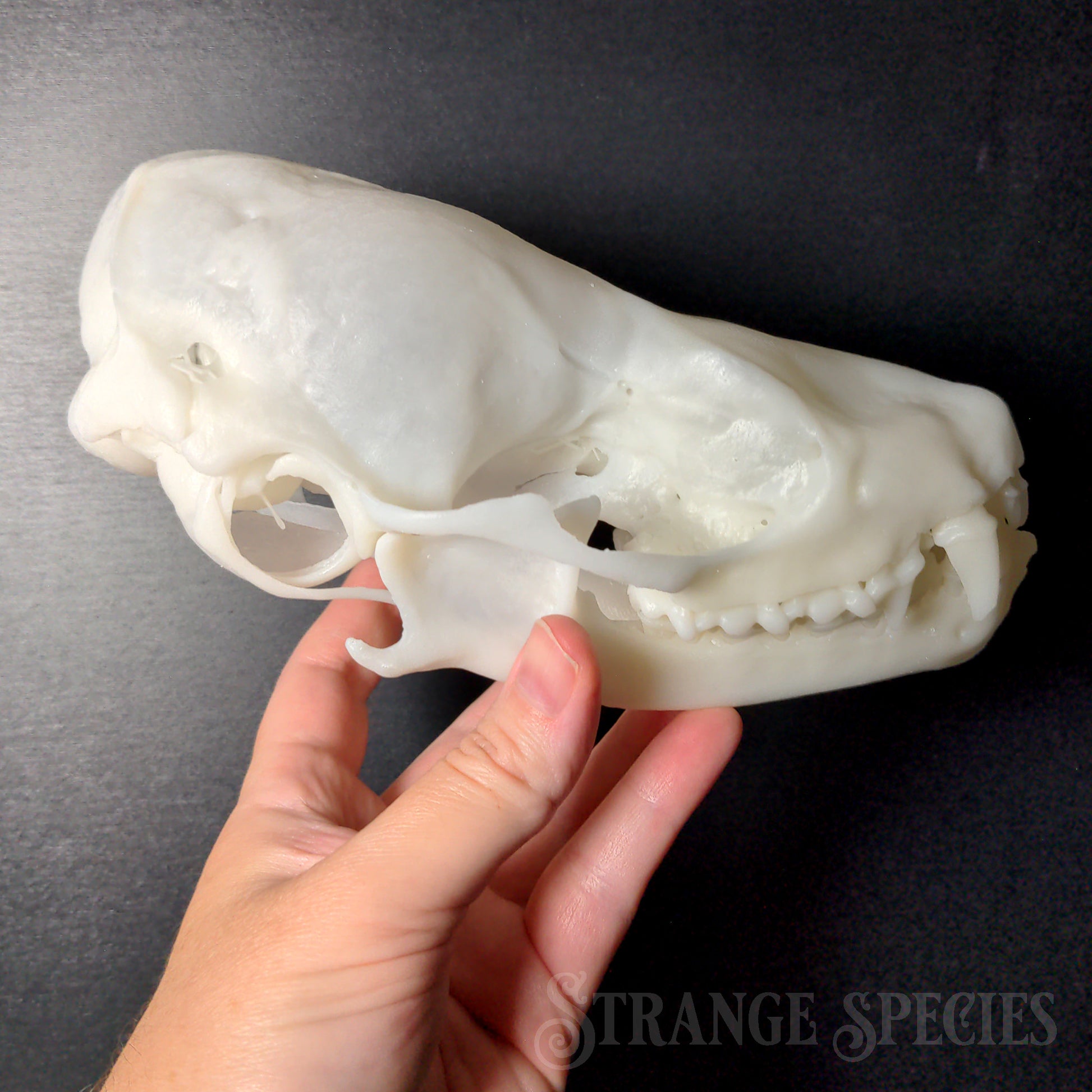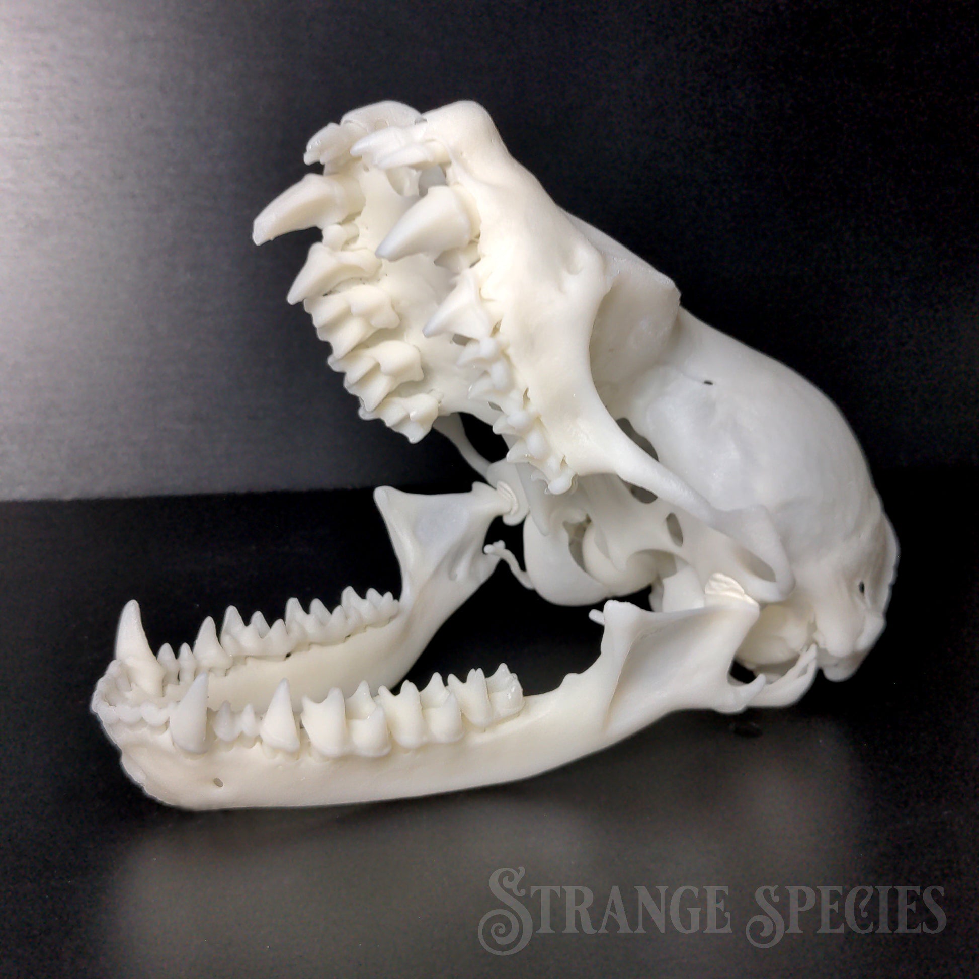 This perfectly unusual piece will add a little mystery to any bone collection, and makes a great gift for anyone interested in science, anatomy, Vulture Culture, and everything spooky. The mandible is a separate piece, which allows for study of the animal's jaw action as well as closer inspection of all parts from the palate to the dentition. The skull has an interesting flat-snouted appearance that provides an excellent contrast of evolutionary osteology compared to other available species like the vampire bat or wrinkle-faced bat.